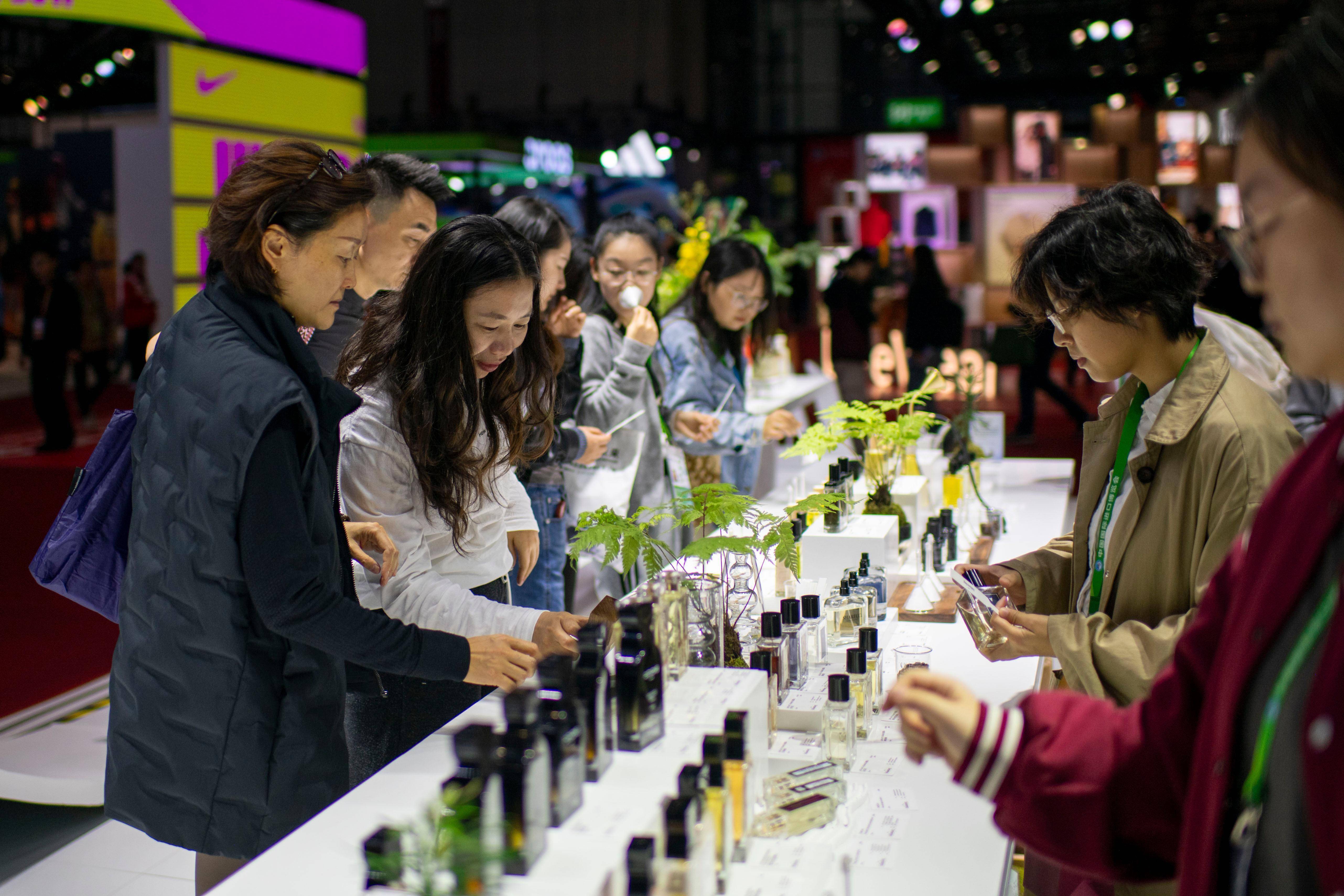在第八届进博会消费品展区,参观者正在品鉴香氛。人民网记者 翁奇羽摄