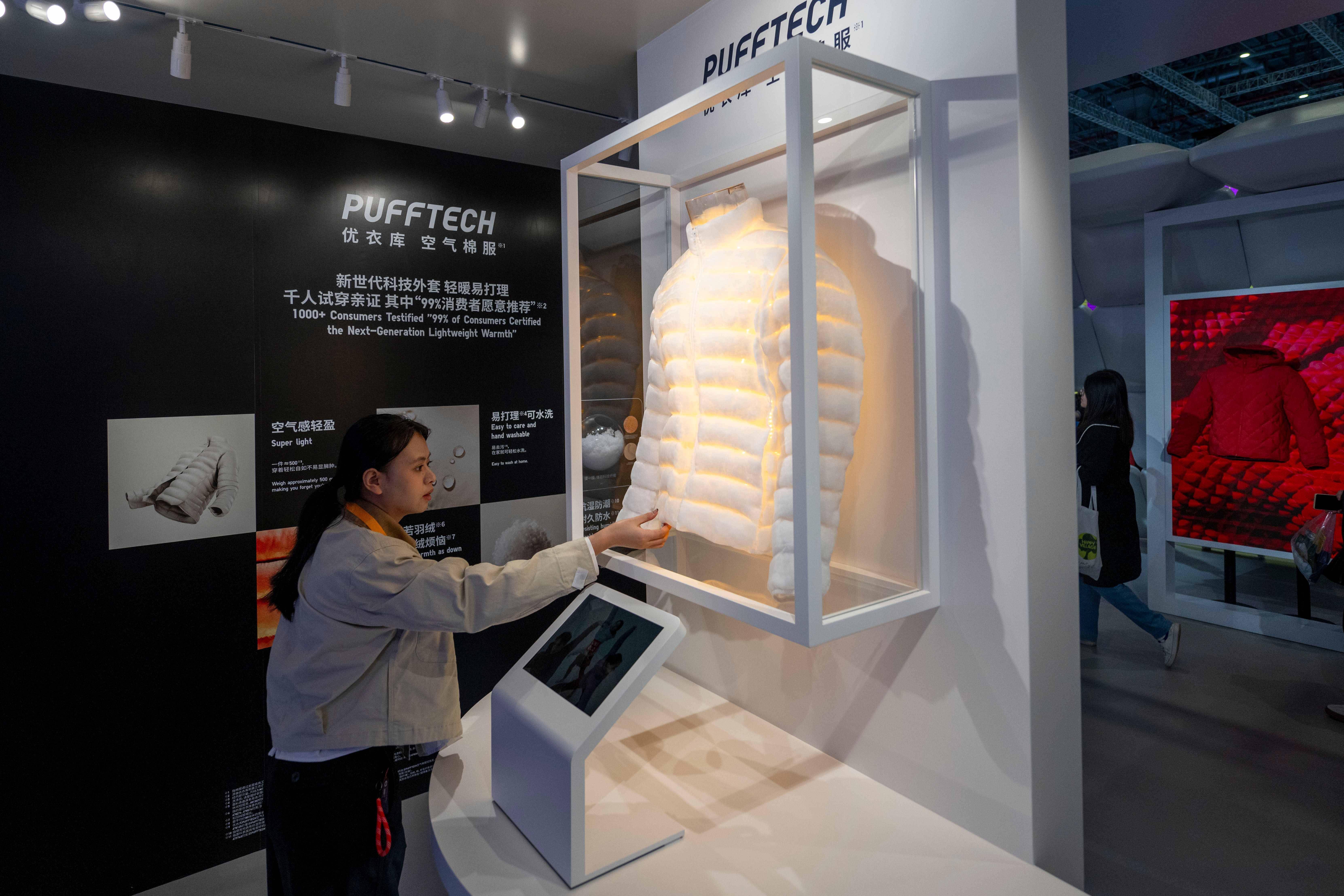 在第八届进博会消费品展区的优衣库展台,空气棉服吸引参观者目光。人民网记者 翁奇羽摄