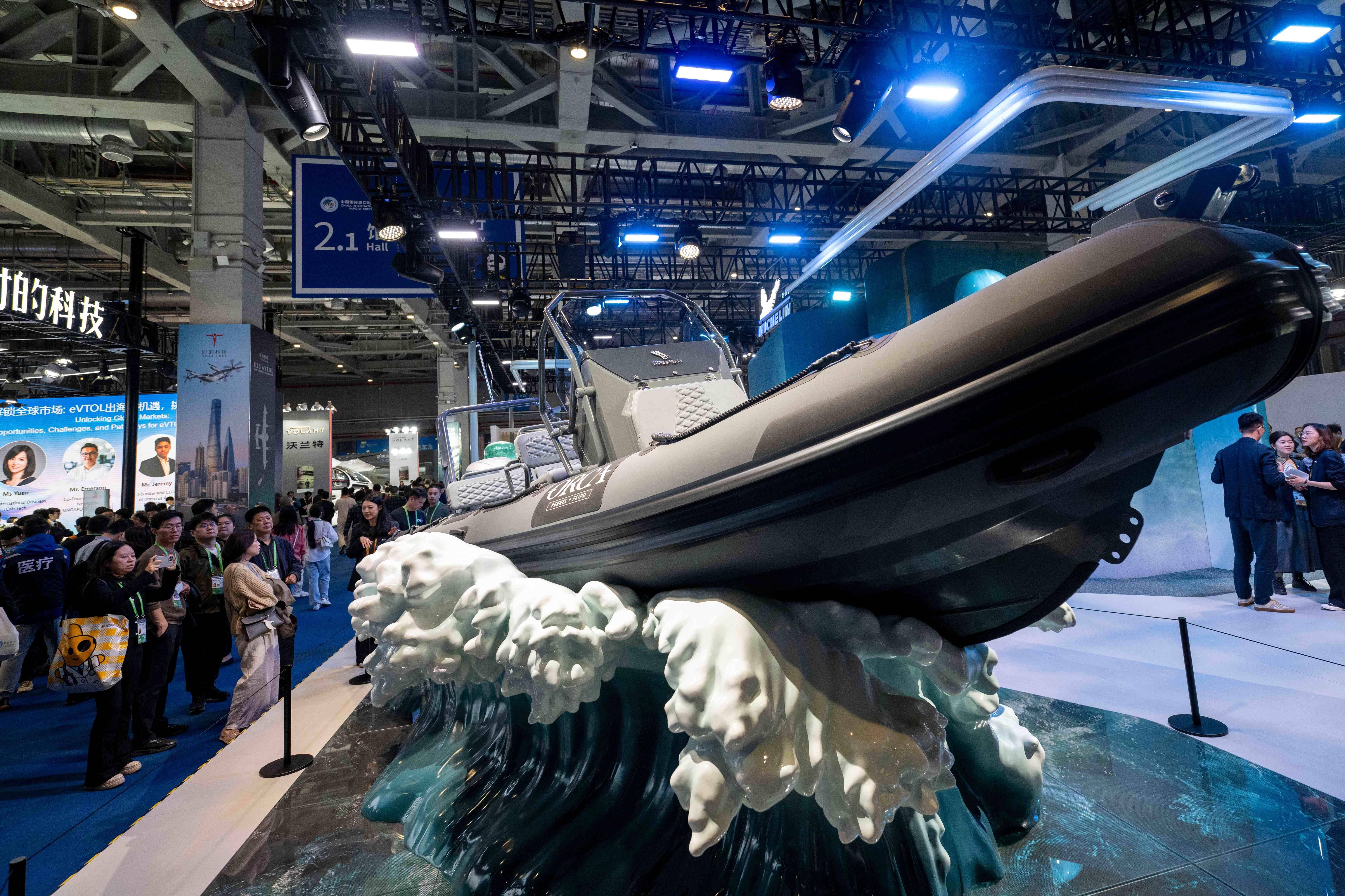 在第八届进博会汽车及智慧出行展区的米其林展台,采用复合涂层材料的刚性充气艇引人注目。人民网记者 翁奇羽摄
