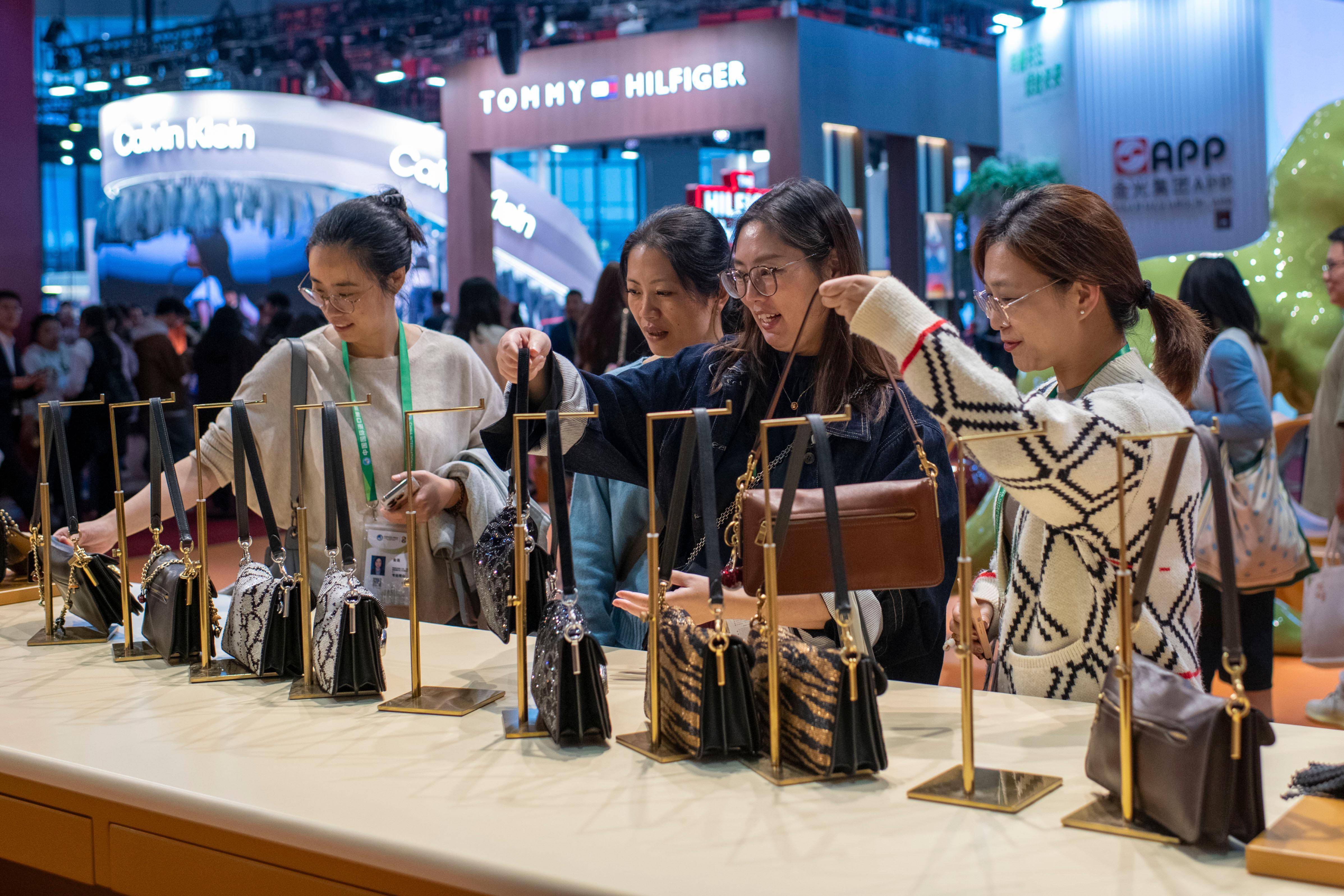 在第八届进博会消费品展区的Coach展台,时尚背包引人注目。人民网记者 翁奇羽摄