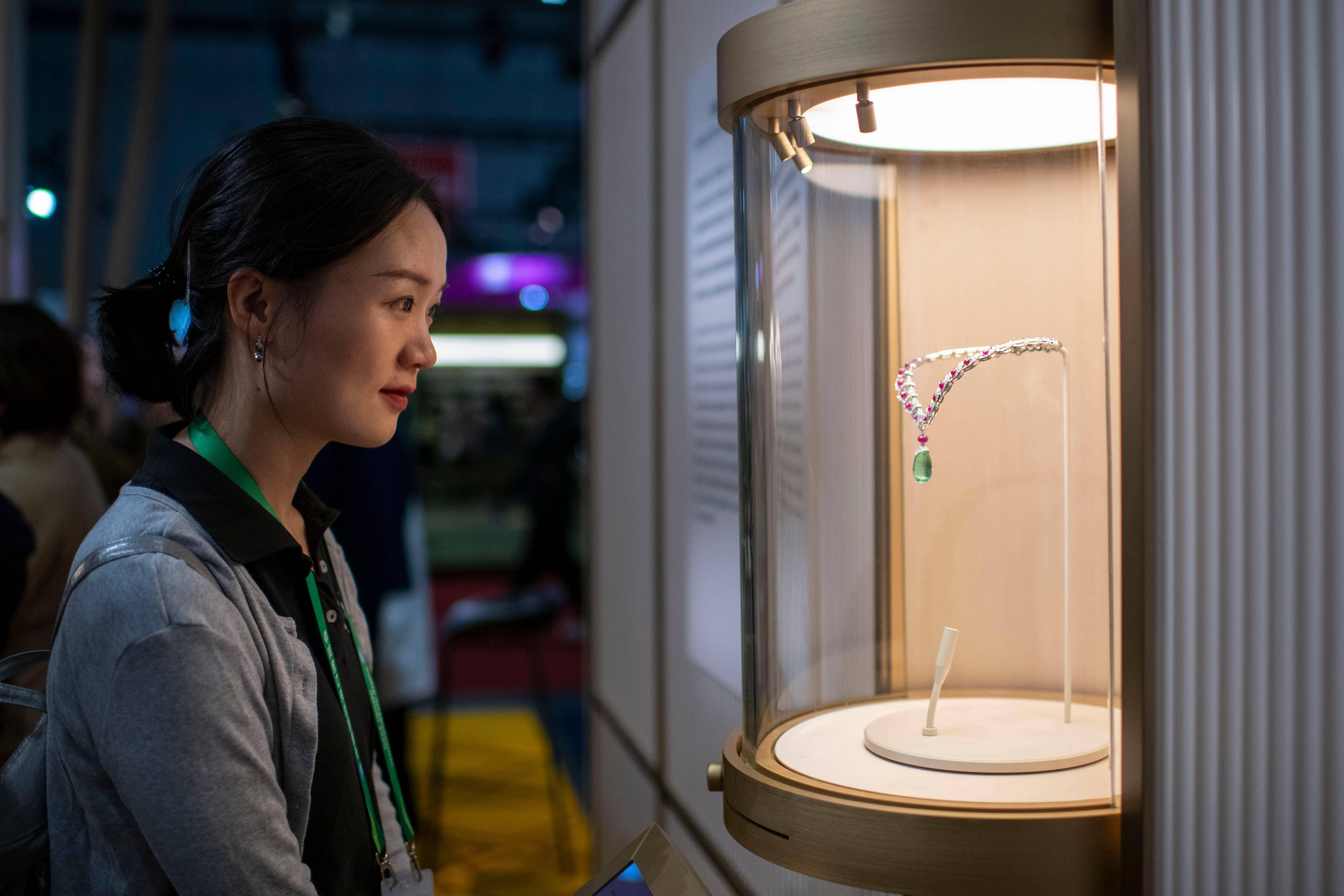 在第八届进博会消费品展区,珠宝项链吸引参观者驻足观赏。人民网记者 翁奇羽摄