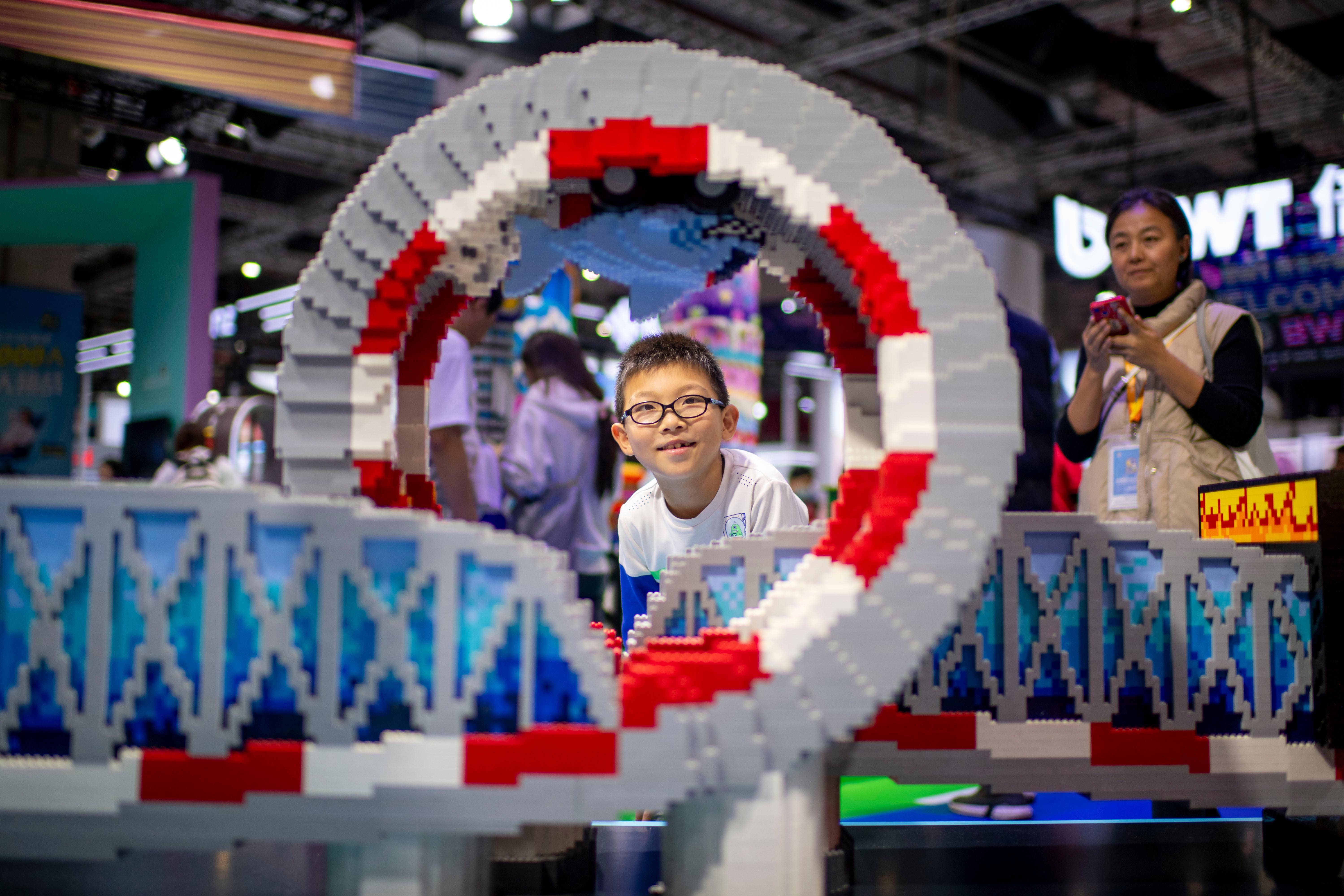 在第八届进博会消费品展区,乐高展品吸引小朋友目光。人民网记者 翁奇羽摄