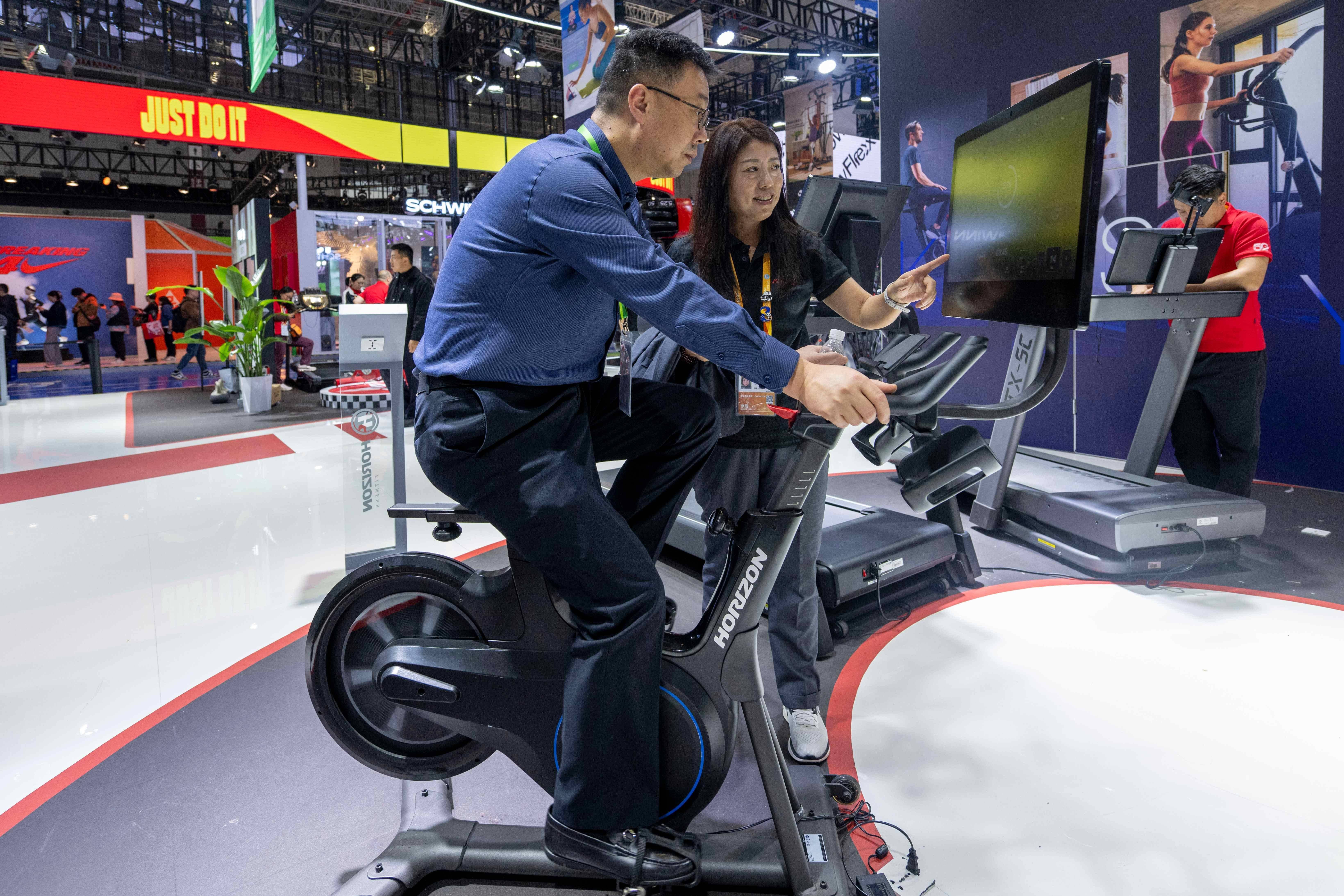 在第八届进博会消费品展区,参观者正在体验健身设备。人民网记者 翁奇羽摄