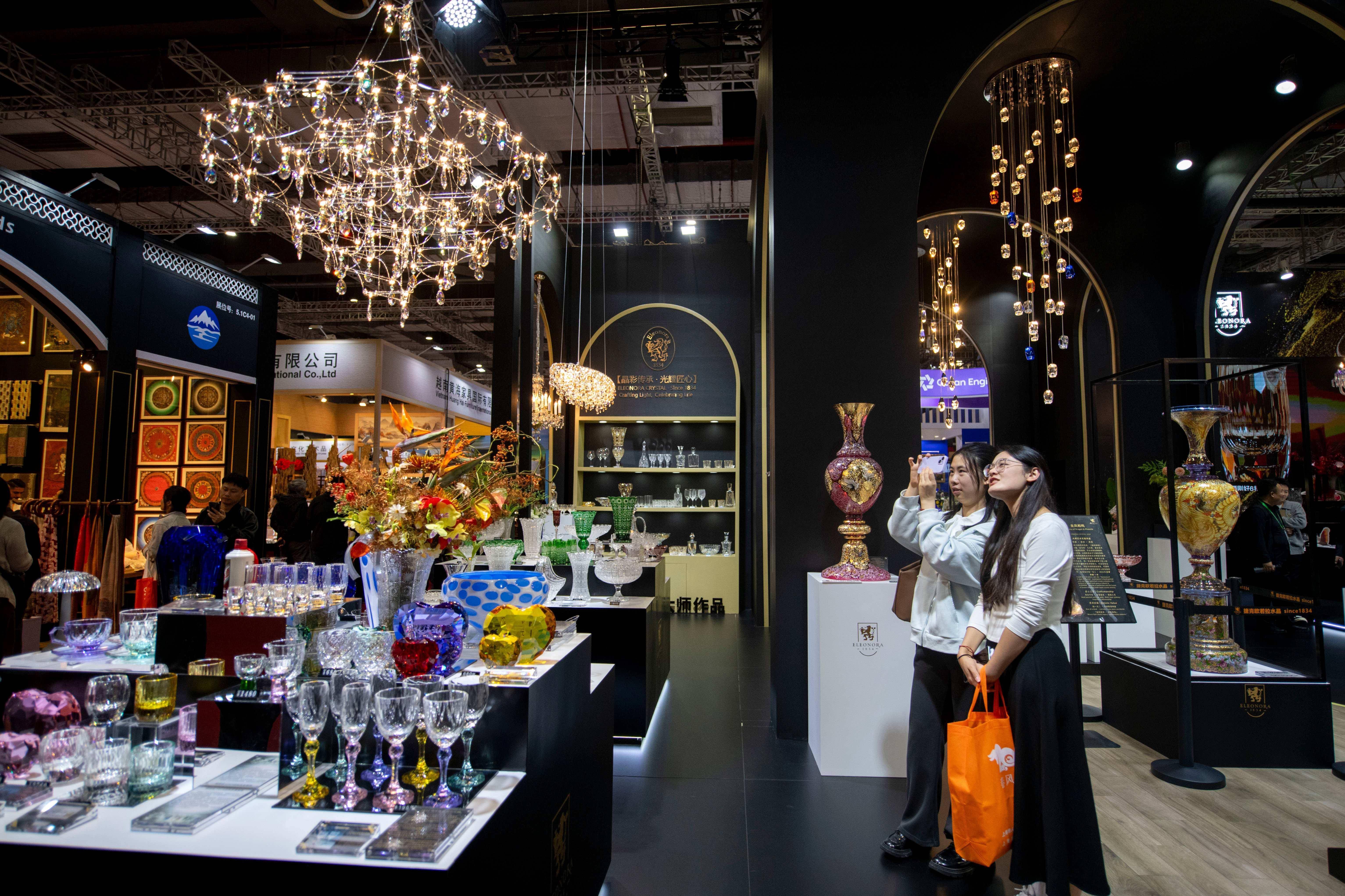 在第八届进博会消费品展区,参观者被来自捷克的水晶工艺品深深吸引。人民网记者 翁奇羽摄